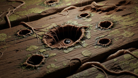 captures a detailed, close-up view of weathered wooden planks. Several circular holes are visible, some appearing deep and dark, hinting at decay or damage. Thin, wiry roots or vines are creeping across the surface and into the holes, adding an organic, natural to the aged wood. Patches of green moss or lichen are scattered across the brown planks, further emphasizing the texture and natural weathering. The lighting creates a sense of depth and highlights the intricate details of the wood...