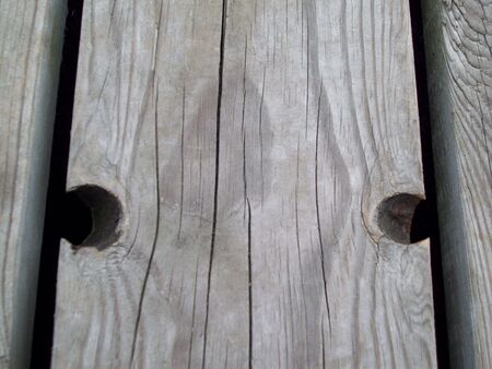 Parallel wooden planks with a series of evenly spaced, hand drilled holes create a textured and geometric pattern, suitable for backgrounds and design elements