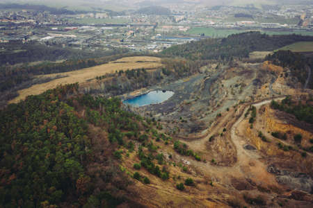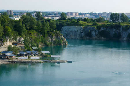 Wild abandoned sand quarry. Trees and a lake in an old sandy quarry.