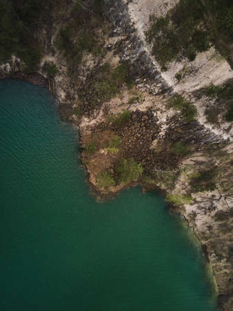 Aerial drone view Basalt columns Amazing industrial landscape, on Emerald lake in a flooded quarry, opencast mine. Open pit mine with lake, travel Ukraine.