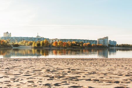 Autumn river landscape. Golden autumn trees and water.