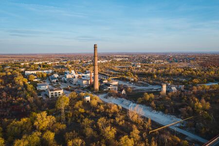 Old manufacturing factory with high funnel pipe, aerial view