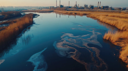 Aerial view of a polluted river with industrial buildings along the banks, environmental issues