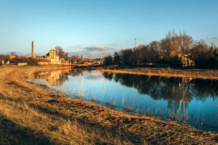 Begej still water in Town of Zrenjanin, Vojvodina province in Serbia. Autumn scenery landscape.