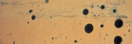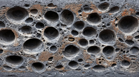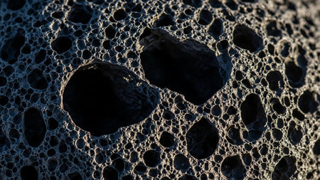 Textured surface showcases numerous bubbles and voids in a dark material illuminated by natural light, highlighting the intricate details and patterns formed over time.