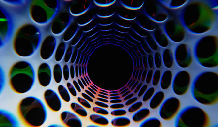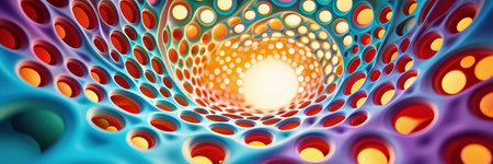 A vibrant, glowing tunnel with many circular holes creating a colorful pattern that radiates light from the center, forming a visually striking effect.