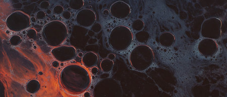 Water bubbles in oil create a striking contrast against a dark background with a viscous texture