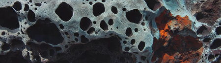 Macro view of a dark gray porous rock surface with many small holes and two large openings.