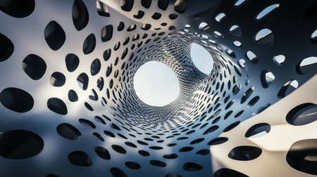 Looking upward through a modern structure featuring a series of circular openings creating an intriguing visual effect against the sky.