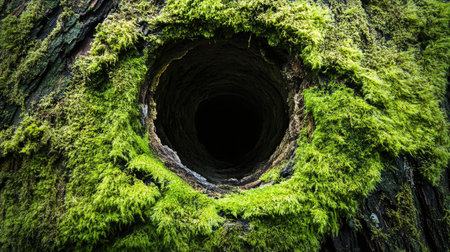 This image showcases a close-up view of a hollow tree trunk covered in vibrant green moss, highlighting the textures and natural beauty of the forest environment.