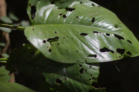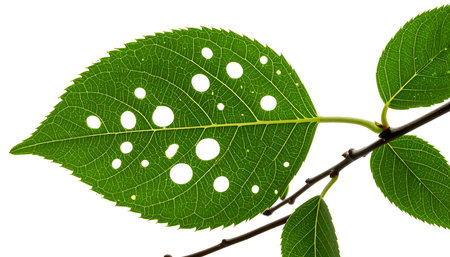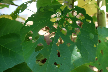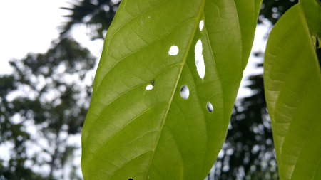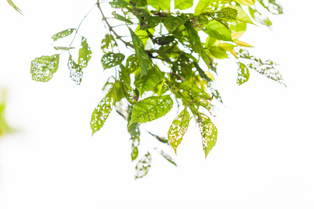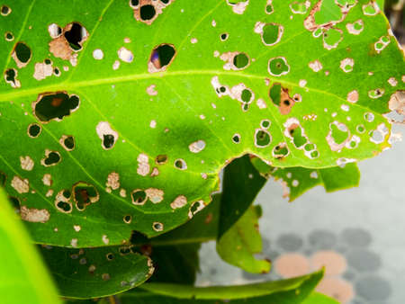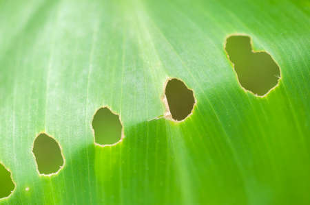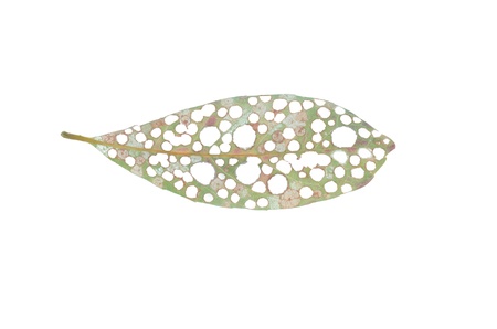 Torn green leaf isolated on white background, worm pests eat the leaves