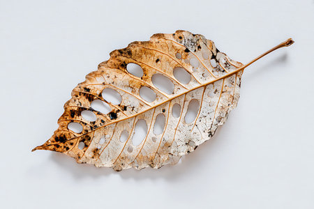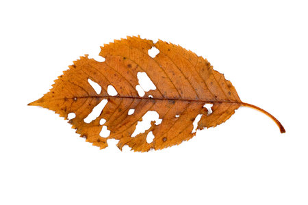 Yellow autumn leaf with holes. Old cherry leaf on white background.