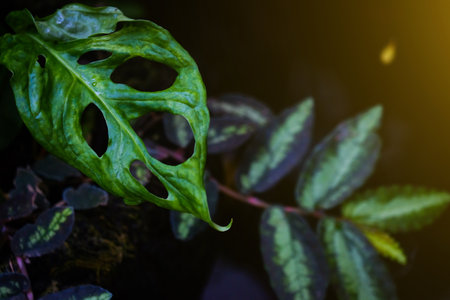 Green leaves on dark background with filter effect retro vintage style and soft focus