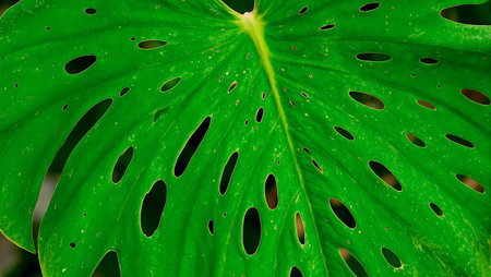Detailed close up of a monstera leafs underside showcasing its iconic holes and waxy texture
