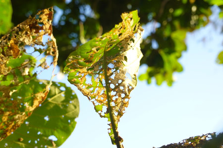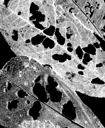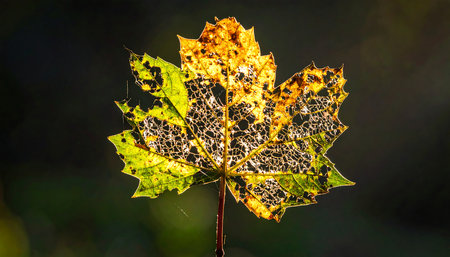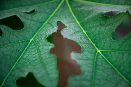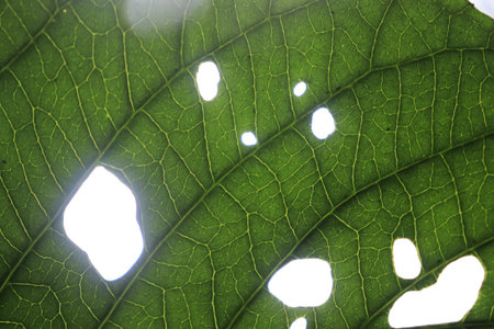 Extreme close-up of a green and brown leaf showing intricate veins and holes. Clear details and vibrant colors...