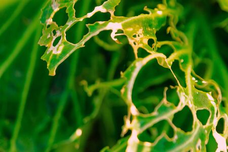 Cabbage leaves in holes in the garden. Pests are a cabbage butterfly that lays eggs and caterpillars of pests appear that eat a cabbage leaf. Close-up