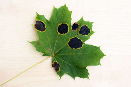 Yellow Maple leaves with black and white spots. Fungal disease or tar spot on maple leaf caused by Rhhytisma acerinum fungus