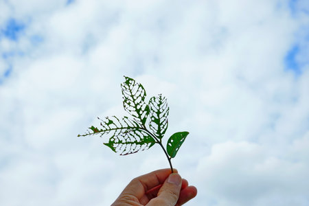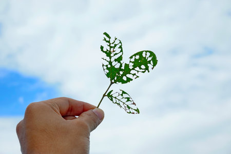 A hole in a leaf caused by insects, holding the leaf up to the sky