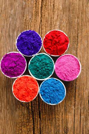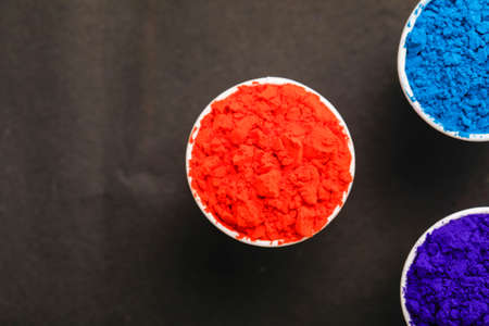 Holi color powder. Organic Gulal colours in bowl for Holi festival, Hindu tradition festive. Bright vibrant pigment closeup