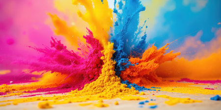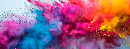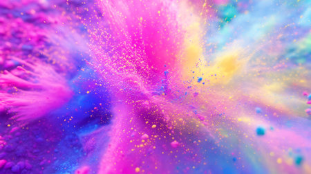 Vibrant explosion of multicolored powder against a black background, creating a dramatic burst of energy