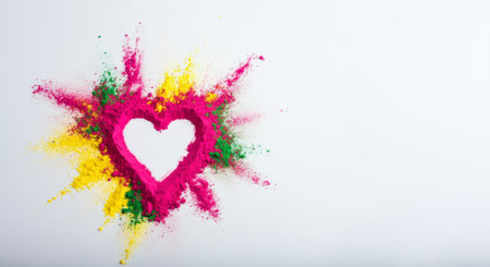 Bright Holi powders forming a heart shape on a smooth white table, symbolizing love and unity during the festival.