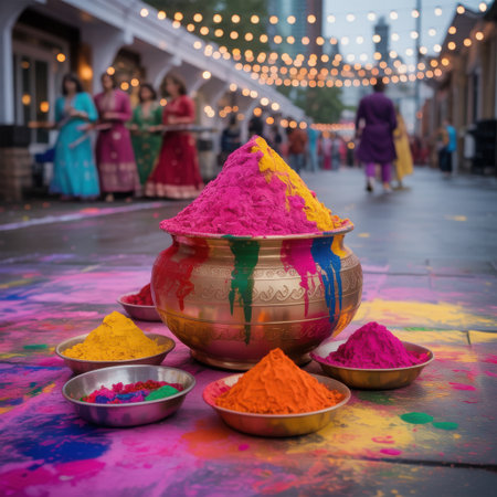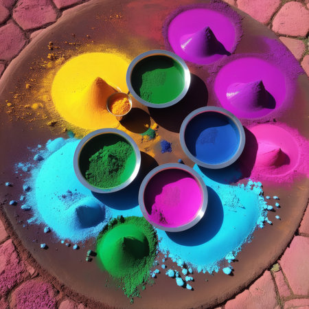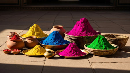 Bright colored powders are artfully arranged in bowls showcasing a stunning variety of colors perfect for a festive celebration. The atmosphere is lively and joyful.