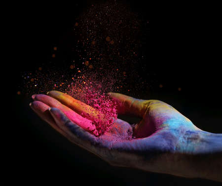 Happy Holi, Concept Indian color festival. close-up female hands with colored powder over dark