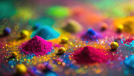 Colorful powders and beads scattered on a surface, representing creativity, vibrancy, and celebration with a shallow depth of field.