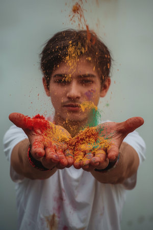 A man in action throwing vibrant colored powder on his hands, creating a cloud of colorful particles in the air.