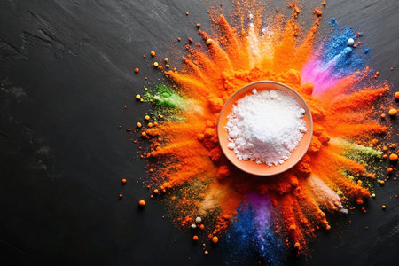 A striking splash of vibrant powders in yellow, orange, and pink against a dark surface. Perfect for artistic projects, backgrounds, or creative designs.