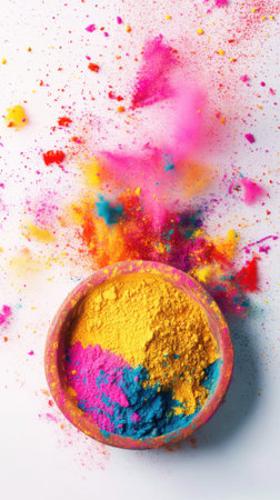 Bright yellow pink and blue Holi powder in a clay bowl with vibrant color splashes on a white background
