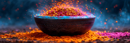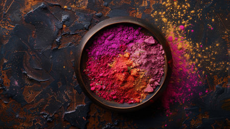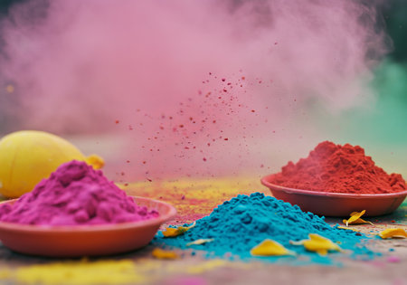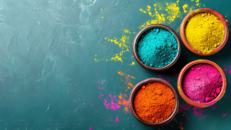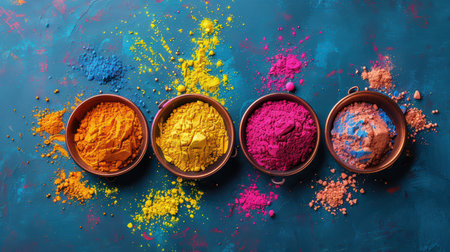 Colorful powders in bowls showcase the vibrant essence of Holi, a celebration of life and joy. Perfect for projects centered on festivals, culture, and color.