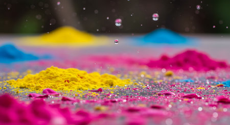 The vibrant colors of scattered powder create a lively, joyful atmosphere. The presence of water droplets suggests movement or activity around these colorful piles.