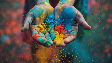 Close-up of hands cupping vibrant colored powder with glowing particles and smoky effects, symbolizing creativity and celebration against a dark background.