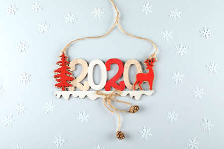 wooden figures denoting the year and spruce twigs on light wood surface top view / modest 2020