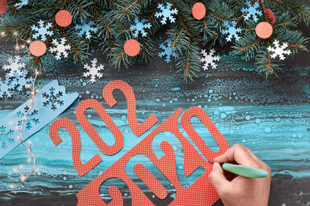 Close-up of wooden numbers 2021 on orange background with stars and cristmas tree . Change year 2020 to 2021.