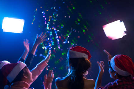 Young Asian group man and women dancing new year christmas party in midnight december at nightclub countdown luxury blurry.