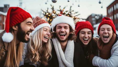 Happy friends wearing santa claus hat celebrating Christmas eve together, Young people having fun walking in Christmas market street, Winter holidays.