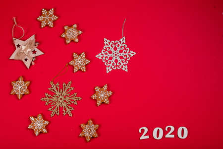 Christmas decor 2020 on gray background. Flat lay, top view.