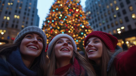 Three friends stand in front of a large Christmas tree, smiling and looking up at the lights