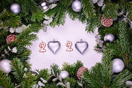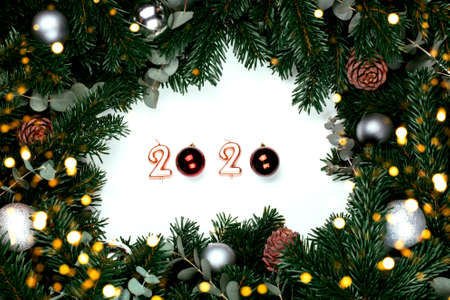 Numbers 2020 with branches of a Christmas tree on a white background with a decorative balls and cones