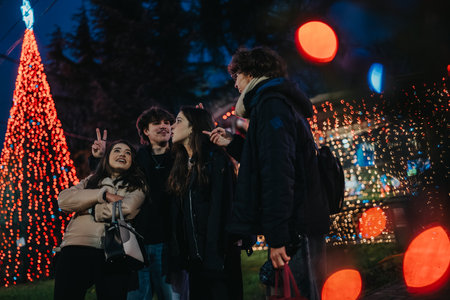 Group of diverse young adults wearing Santa hats taking selfie with warm bokeh lights and Christmas decor. Perfect for holiday marketing, social media campaigns, and seasonal advertising.