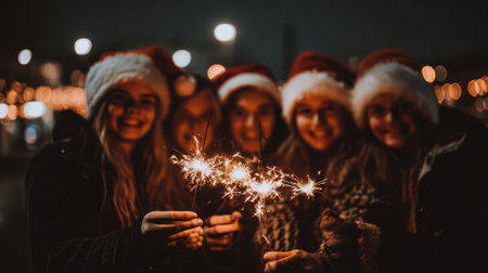 A group of young women in Santa hats holding sparklers and smiling at a nighttime event with bokeh lights in the background.