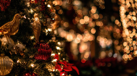 A festive and cozy scene featuring a Christmas tree adorned with red ribbons, golden baubles, and twinkling lights, creating a magical holiday atmosphere.