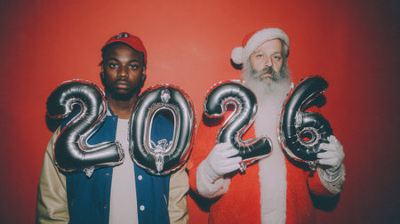 A festive image featuring two men, one dressed as Santa Claus and the other as a young man, holding silver balloons that spell out the year 2026.