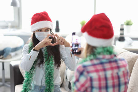 Woman in red hat and tinsel take photo on phone. Girlfriend in protective mask pose and make heart sign with hand.