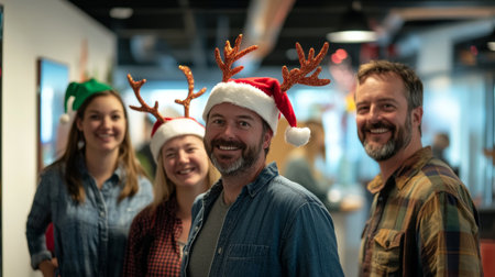 Group of young business people celebrating Christmas, wearing Santa Claus hats and glasses.