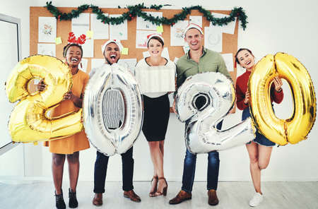 2020 is our year to shine. Full length shot of a group of businesspeople holding balloons reading 2020 while celebrating the New Year together at work.