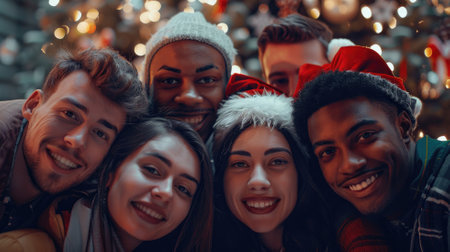 A joyful and diverse group of friends smiles together in a cozy indoor setting decorated for the holiday season, capturing the essence of friendship and celebration.