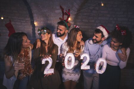 Group of friends having fun at New Years party, holding illuminative numbers 2020 representing the upcoming New Year at midnight countdown